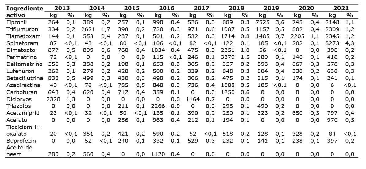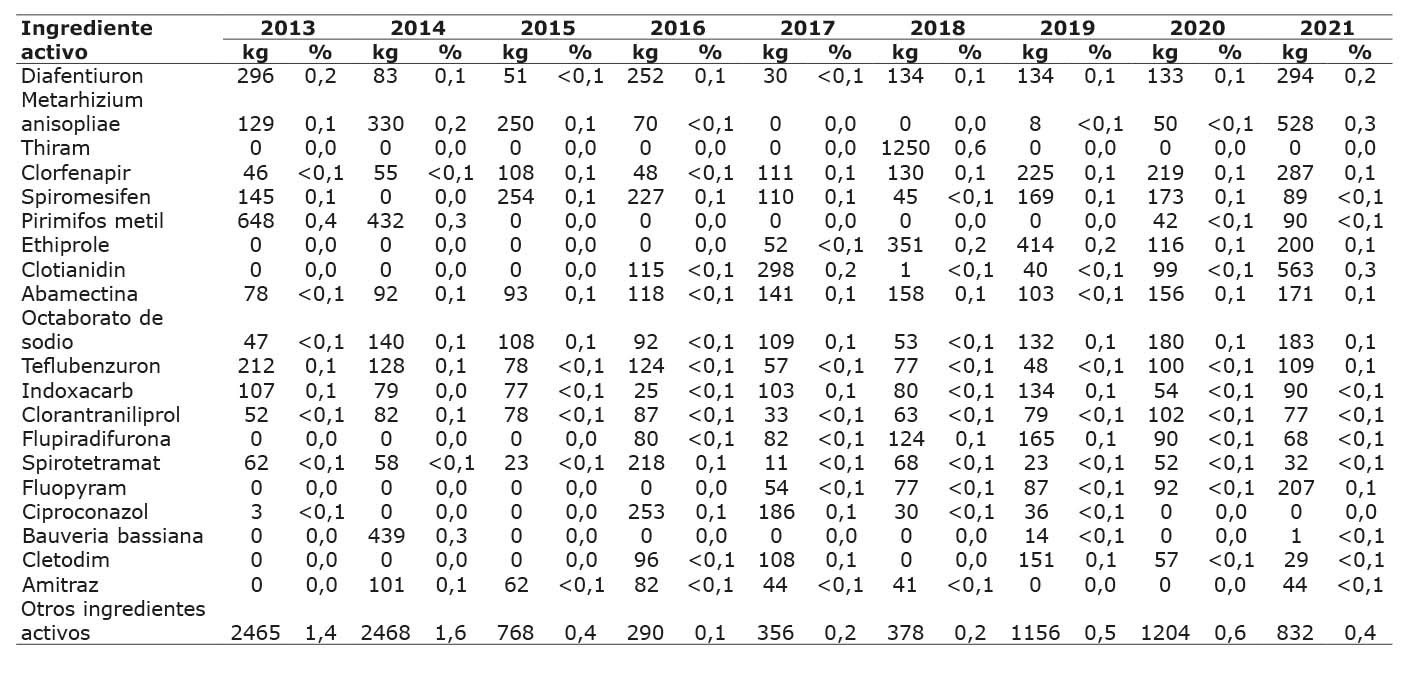 Durante el periodo estudiado se registraron trece i.a. que mostraron tendencia gradual al alza y superaron en 2021 en 50 % o más el volumen importado en 2013. Estos fueron: acetamiprid (3307 %), tiametoxam (1527 %), bifentrina (1143 %), buprofezin (664 %), clorfenapir (530 %), triflumuron (591 %), octaborato de sodio (286 %), lufenuron (142 %), abamectina (118 %), profenofos (105 %), imidacloprid (97 %), aceite mineral parafínico (87 %), lambda-cihalotrina (61 %) y clorpirifos (61 %). En contraste se encontraron once que disminuyeron de forma gradual en 50 % o más el volumen importado entre esos mismos años; estos fueron: endosulfan (-100 %), paration metil (-100 %), etoprofos (-100 %), carbofuran (-100 %), diclorvos (-100 %), ciproconazol (-100 %), pirimifos metil (-81 %), diazinon (-79 %), betaciflutrina (-71 %), dimetoato (55 %) y carbosulfan (-50 %) (Cuadros 4, 5 y 6). En un caso particular, el volumen importado de terbufos, el tercer i.a más importado del periodo disminuyó 43 %.