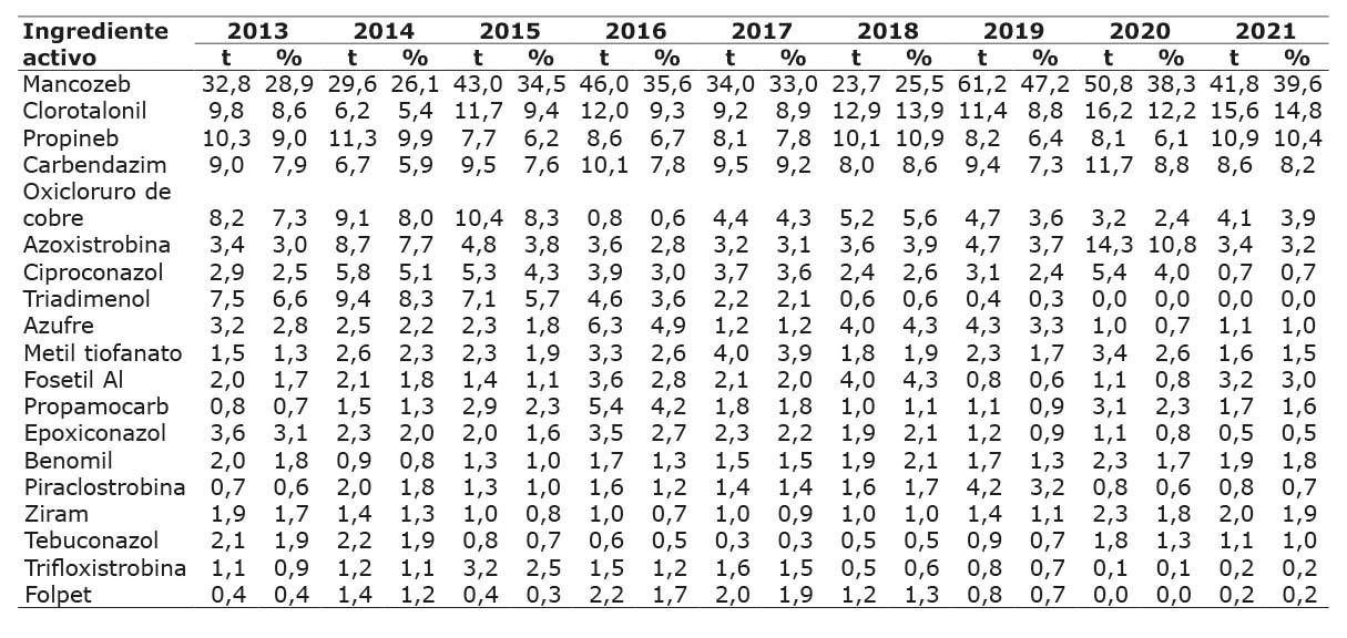 El fungicida que más se importó durante el periodo fue mancozeb, con un mínimo de 23,7 t en el año 2018 y un máximo de 61,2 t en 2019. Estos volúmenes equivalieron al 25,7 % y 47,3 % del total de importaciones de todos fungicidas y bactericidas para esos años, respectivamente. Se observó además un incremento de 27 % en el volumen total importado en 2021 respecto al registrado en 2013 y un aumento global del porcentaje de participación de mancozeb en las importaciones totales de fungicidas y bactericidas entre 2013 y 2021.