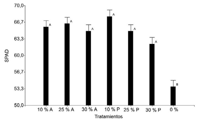 Figure 6. Chlorophyll content (SPAD) of leaf No. 1 of banana plants (Musa AAA cv. Gros Michel) at week 10 of the trial. Universidad de Costa Rica, Turrialba, Costa Rica, July-September, 2022.