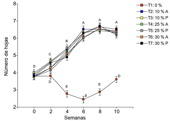 El número de hojas mostró diferencias significativas en la interacción tratamiento por semana (p < 0,0001). El número aumentó con el paso de las semanas en todos los tratamientos con lombricompost (T2, T3, T4, T5, T6 y T7) (Figura 2), cuyas plantas alcanzaron la mayor cantidad (6,5 hojas) en la semana 8. Durante el experimento, el número de hojas fue similar entre los tratamientos con lombricompost. Por el contrario, el T1 presentó la menor cantidad de hojas desde la semana 2 hasta la semana 10.
