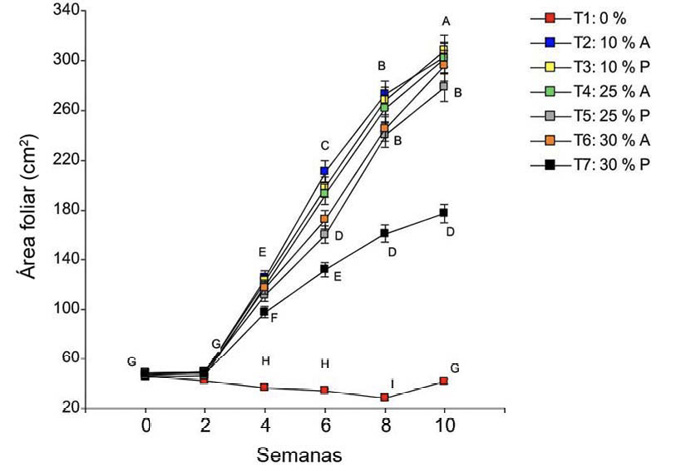 Para el área foliar, se observaron diferencias significativas en la interacción tratamiento por semana (p < 0,0001). En los tratamientos T2 (10 % A), T3 (10 % P), T4 (25 % A), T5 (25 % P) y T6 (30 % A), el área foliar aumentó cada semana hasta superar los 260 cm2 en la semana 10 (Figura 3). El T7 (30 % P) también mostró un incremento semanal; sin embargo, a partir de la semana 4, presentó valores inferiores en comparación con los demás tratamientos con lombricompost. Al final del ensayo, no superó los 180 cm2 y registró la menor área foliar entre los tratamientos con lombricompost.
