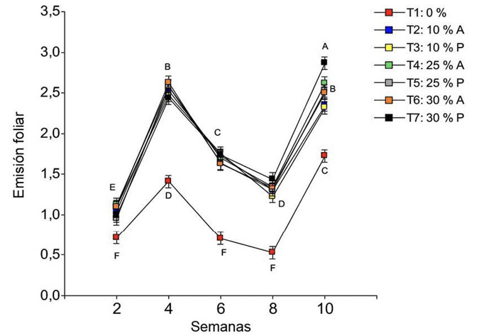 La emisión foliar presentó diferencias significativas en la interacción tratamiento por semana (p < 0,0001). Se observó un aumento de la semana 2 a la 4 y de la 8 a la 10, mientras que de la 4 a la 8 se registró una disminución (Figura 4). Las semanas 4 y 10 fueron las de mayor emisión foliar en las plantas. Por ejemplo, en la semana 4, se obtuvo 2,5 hojas ± 0,07 para el T2; 2,5 hojas ± 0,05 para el T3; 2,6 hojas ± 0,05 para el T4; 2,6 hojas ± 0,03 para el T5; 2,6 hojas ± 0,02 para el T6, y 2,4 hojas ± 0,05 para el T7. En la semana 10, los valores fueron 2,3 hojas ± 0,09 para el T2; 2,3 hojas ± 0,09 para el T3; 2,6 hojas ± 0,02 para el T4; 2,5 hojas ± 0,07 para el T5; 2,5 hojas ± 0,2 para el T6, y 2,9 hojas ± 0,1 para el T7. Este último tratamiento obtuvo la mayor emisión foliar de todos los evaluados.