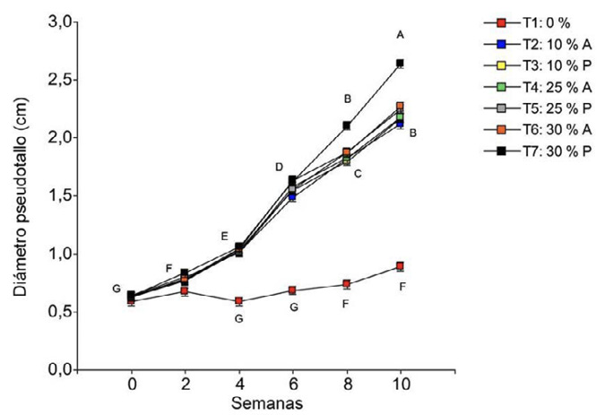 Se observaron diferencias significativas en la interacción tratamiento por semana (p < 0,0001) en el diámetro del pseudotallo de las plantas. Los tratamientos T2 (10 % A), T3 (10 % P), T4 (25 % A), T5 (25 % P) y T6 (30 % A) mantuvieron diámetros similares entre sí a lo largo del experimento, con valores entre 2,0 y 2,3 cm. Sin embargo, a partir de la semana 8, las plantas del tratamiento T7 (30 % P) presentaron un crecimiento superior en el diámetro del pseudotallo, que alcanzó un promedio de 2,6 cm ± 0,06 (Figura 5).