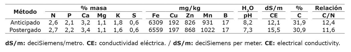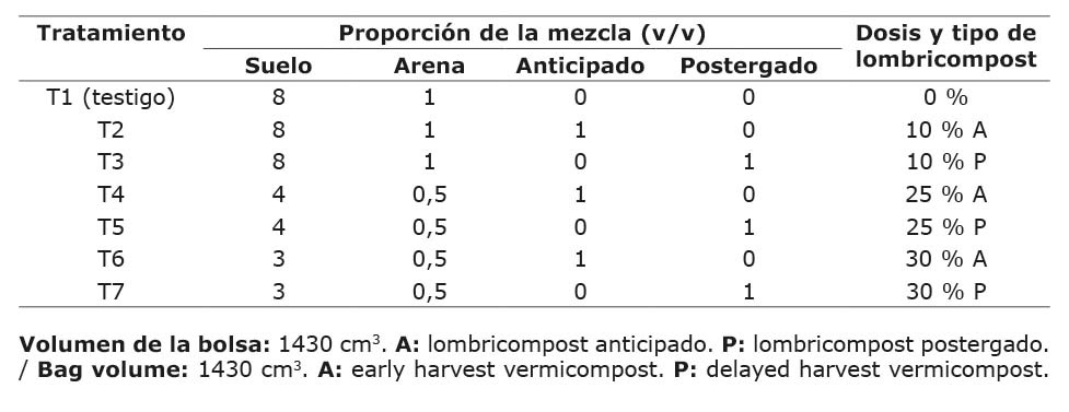 Se prepararon sustratos con suelo estéril, arena de río y lombricompost obtenido de dos procesos de producción distintos, denominados “anticipado” (A) y “postergado” (P). Esto se produjeron mediante el lombricompost de excrementos vacunos de la raza Jersey de la lechería de la Sede del Atlántico de la Universidad de Costa Rica. El proceso se ejecutó con la lombriz roja californiana (Eisenia foetida), durante doce semanas. La diferencia entre los procesos radicó en el momento de la cosecha: el postergado se recolectó en su totalidad 14 semanas después del inicio del proceso, mientras que en el anticipado se realizaron cosechas superficiales semanales a partir de la octava semana. Las características químicas de ambos procesos se presentan en el Cuadro 1.