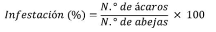 Previo a las aplicaciones, se evaluó el porcentaje de infestación por V. destructor, por medio de la metodología de “lavado de abejas” (De Jong et al., 1982). Para ello, se recolectaron 200 abejas y se colocaron en un frasco con alcohol al 70 %, el cual se agitó durante 1 min y luego se filtró a través de dos mallas: una gruesa para separar a las abejas y otra fina para atrapar a los ácaros (Polo Corro et al., 2022). El porcentaje de infestación se calculó mediante la ecuación 1.