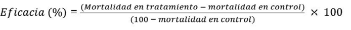 El ácido oxálico se aplicó con un sublimador (X-nox) utilizando 5 o 10 g. Una vez que se alcanzó la sublimación (157-190 °C), se introdujo la boquilla del sublimador dentro de la piquera y se realizaron de 7 a 8 bocanadas de aire durante 5 s, con flujos suaves (Moyano Morocho, 2021). Se llevaron a cabo tres aplicaciones cada ocho días y el número de ácaros muertos se registró a los 4, 12, 20 y 30 días. Se colocó una malla para determinar el número de ácaros muertos y evitar que las abejas entraran en contacto con los residuos (Koumad & Berkani, 2019). La especie de ácaro se identificó usando la clave taxonómica proporcionada por el Identification Technology Program (2016), mientras que la especie de abeja se determinó por medio de los caracteres morfológicos descritos en Meixner et al. (2013). Finalmente, se calculó el porcentaje de efectividad en el control de la varroasis para cada tratamiento, en comparación con el testigo, mediante la ecuación 2.