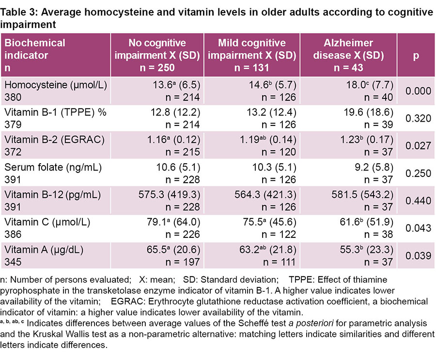 To compare the three groups (AD, MCI, and without cognitive impairment), a one-way analysis of variance was conducted, with a posteriori tests to identify different groups using parametric tests or their non-parametric alternatives depending on whether they met the assumptions of group normality and homoscedasticity. A significance level of p = 0.05 was adopted. The test of homogeneity between groups was applied to the biochemical variables. The Pearson correlation was calculated as a measure of linear association of homocysteine levels with folate, vitamins B-12 and B-2. The prevalence of hyperhomocysteinemia was calculated as well as the prevalence of vitamin deficiencies, taking as reference the group with no cognitive impairment (with confidence intervals estimated at 95%). The statistical procedure used SPSS Statistics version 20 software (IBM, USA).