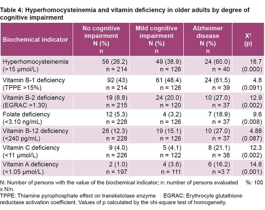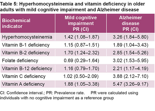 The prevalence of vitamin deficiency in B-2, folate, C, A and hyperhomocysteinemia were significantly more common in individuals with AD than in individuals with no cognitive impairment. Vitamins B-1 and B-12 deficiencies showed the same pattern but were not statistically significant (Table 4).