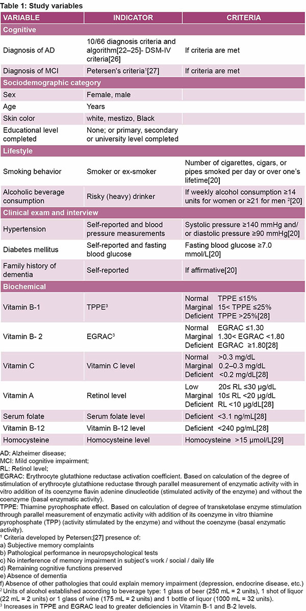 INTRODUCTION Age-related cognitive disorders, including Alzheimer disease, are among the main causes of disability and dependence in older adults worldwide. High blood homocysteine levels (hyperhomocysteinemia) are a risk factor for diseases whose metabolism involves different B vitamins. Antioxidant vitamins provide a protective effect by mitigating oxidative stress generated by these diseases. Epidemiological studies have presented varying results on the relationships between blood levels of these vitamins and such cognitive disorders. OBJECTIVE Evaluate the association of vitamin and homocysteine levels with mild cognitive impairment and Alzheimer disease in a group of Cuban older adults. METHODS A cross-sectional study was conducted in Havana, Cuba, of 424 persons aged ≥65 years: 43 with Alzheimer disease, 131 with mild cognitive impairment, and 250 with no signs of cognitive impairment. Dementia was diagnosed using criteria of the International 10/66 Dementia Research Group and Diagnostic and Statistical Manual of Mental Disorders (DSM IV), and mild cognitive impairment was diagnosed using Petersen’s criteria. Blood levels of vitamins (thiamine, B-2, folate, B-12, C and A) and homocysteine were measured by standard procedures. Analysis of variance for continuous variables and percentage comparison tests for dichotomous variables were used to compare groups. RESULTS Persons with Alzheimer disease presented significantly lower levels of vitamins B-2, C and A than healthy participants (p <0.05). Homocysteine levels were significantly higher in those with Alzheimer disease and mild cognitive impairment than in participants with no cognitive impairment (p <0.05). Statistically, levels of thiamine, folic acid, and vitamin B-12 were not significantly different across groups. Compared with those without cognitive impairment, prevalence rates (PR) in the Alzheimer group were significantly higher for hyperhomocysteinemia (PR = 3.26; 1.84–5.80) and deficiency of all B vitamins: thiamine (PR = 1.89; 1.04–3.43), B-2 (PR = 2.85; 1.54–5.26), folate (PR = 3.02; 1.53–5.95), B-12 (PR = 2.21; 1.17–4.19), vitamin C (PR = 3.88; 2.12–7.10) and A (PR = 5.47; 3.26–9.17). In mild cognitive impairment, prevalence rates were significantly higher for hyperhomocysteinemia (PR = 1.42; 1.08–1.87), vitamin B-2 deficiency (PR = 1.70; 1.24–2.32) and vitamin A deficiency (PR =1.88; 1.05–3.38). CONCLUSIONS Hyperhomocysteinemia and various vitamin deficiencies are related to Alzheimer disease and mild cognitive impairment. Longitudinal studies are needed to further elucidate the relationship between different nutritional biomarkers and dementia. A better understanding of this relationship could provide a basis for therapeutic and preventive strategies.