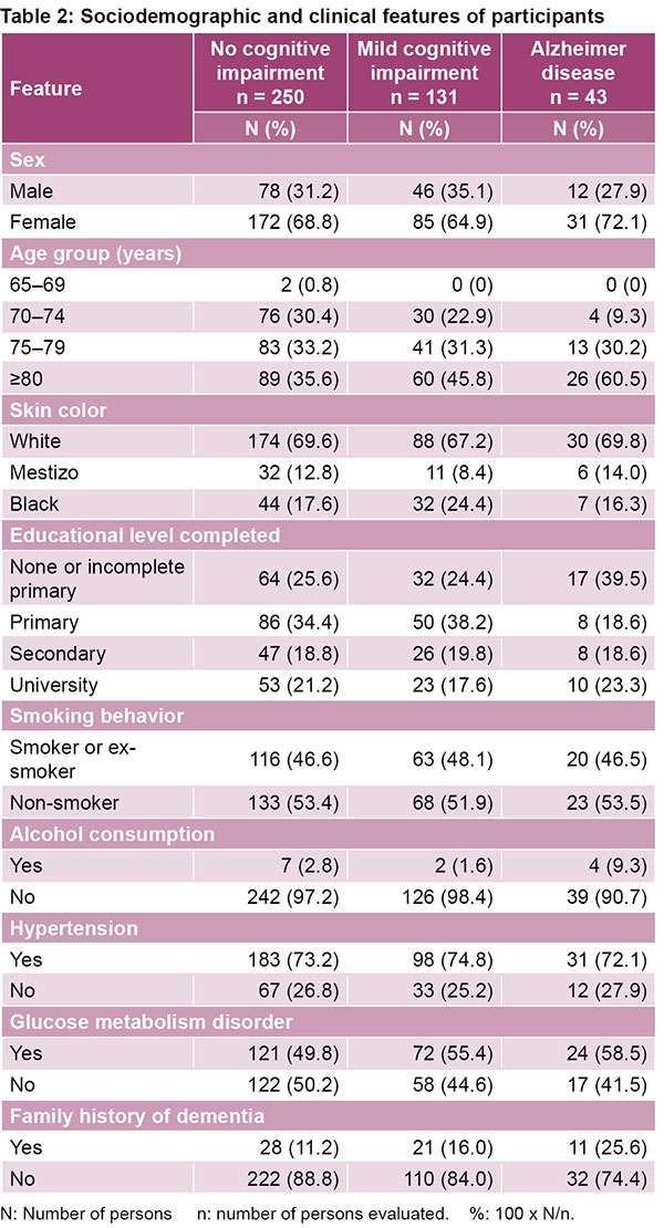 The average age was 78 years old in the group with no cognitive impairment, 79.5 in the MCI group and 82.8 in the AD group. Other sociodemographic and clinical features were similar across groups, except family history of dementia, which was more common in the groups with cognitive disorders. In all three groups, 60% of participants had a low education level (elementary school only), 47% were smokers or ex-smokers, only 3% drank alcohol, 73% had hypertension and 52% had altered glucose (Table 2).