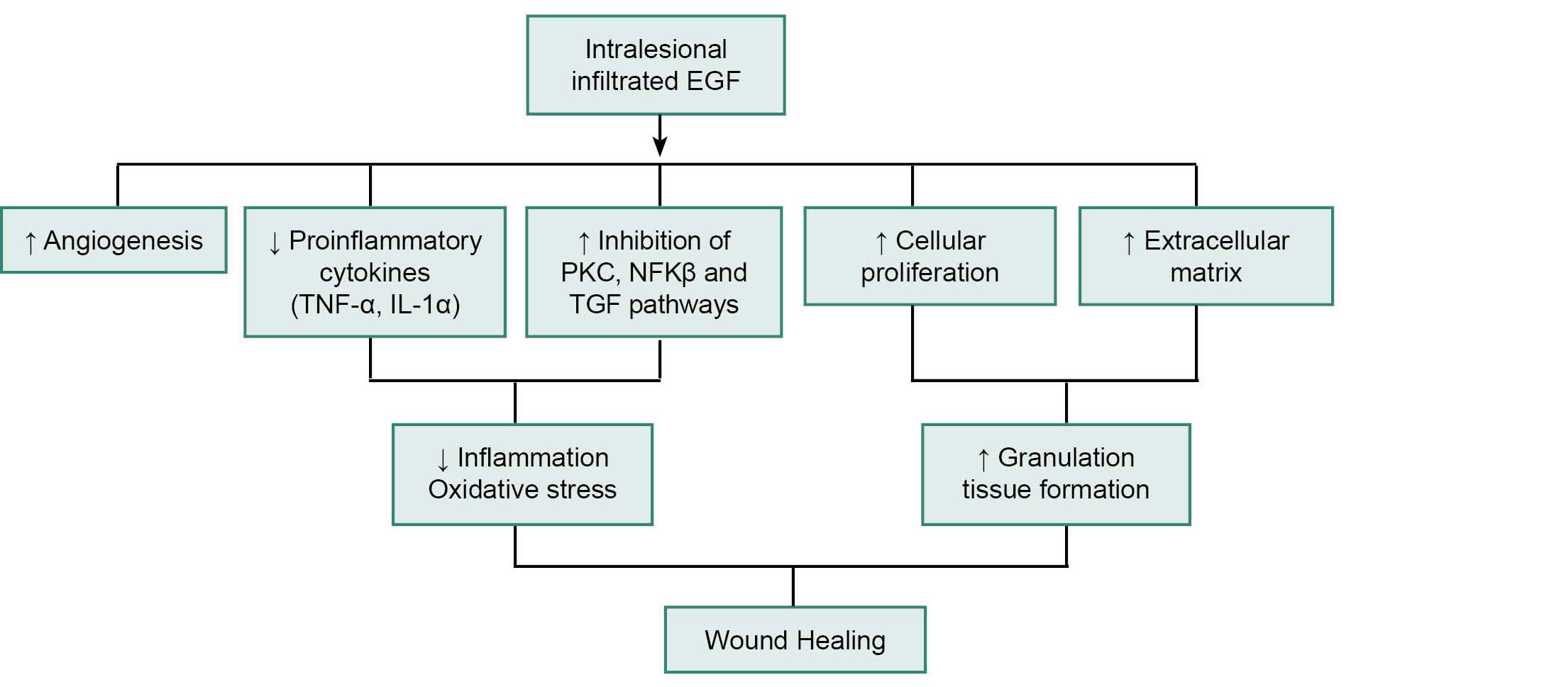The EGF-induced modifications in problem wounds with different pathogenic ingredients suggest that locally-infiltrated EGF stimulates both mesenchymal and ectodermal cell responses, expressed by proliferation, migration, secretion, angiogenesis and survival. Accordingly, EGF infiltration is a DFU-specific therapy that may synchronize local cellular behaviors, thus reversing the chronicity phenotype.[51]