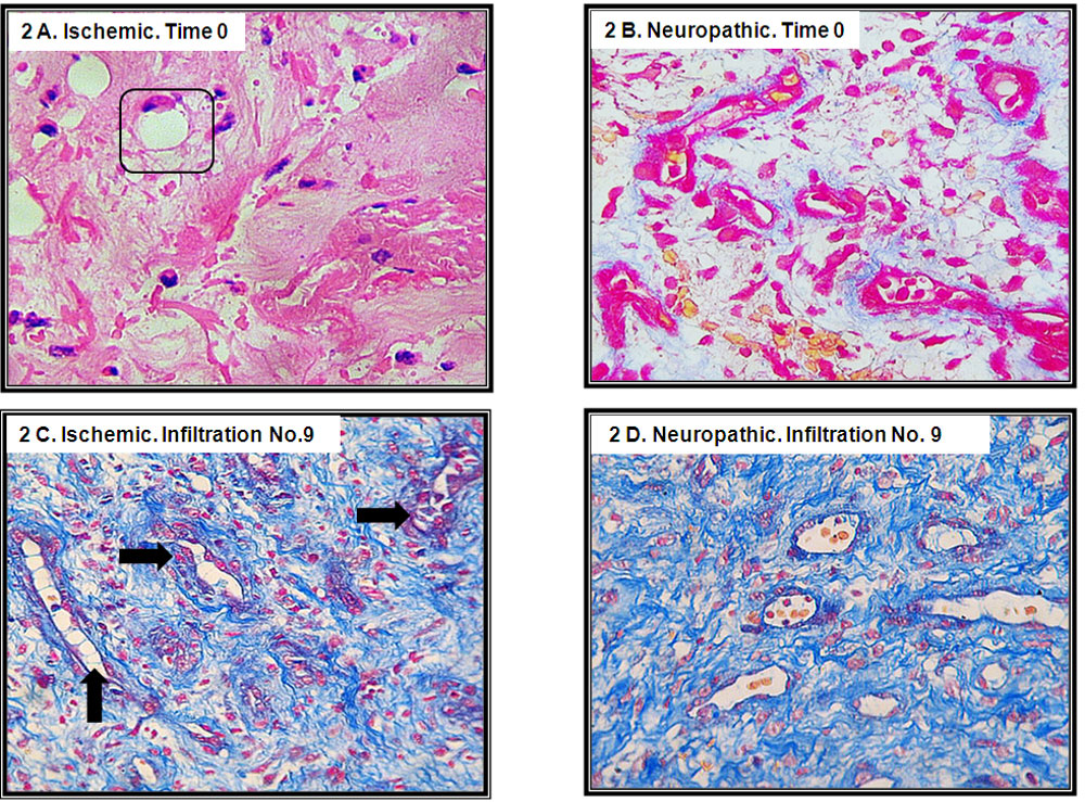 Histological images of granulation tissue biopsies collected prior to the initial EGF infiltrative intervention and after the 9th intervention. Images are representative of the two major etiopathogenic forms of diabetic lower extremity disease: ischemic and neuropathic. 2A: Representative of a clean, ischemic diabetic granulation tissue bed before the first local EGF infiltration. Granulation tissue exhibits a “hardened” hyaline matrix with a general scarceness of functional neovessels. Nonfunctional capillaries are seen since early stages (enclosed). 2B: Representative of an early granulation tissue matrix, collected from a neuropathic lesion exhibiting poor extracellular matrix accumulation, scarce collagen deposition and a limited productive cellularity before EGF treatment. These are all histological hallmarks of protracted, poor healing of neuropathic wounds. 2C: Image showing the transformation of the wound matrix composition, with substantial angiogenic response induced by the local EGF infiltration with patent large vessels (arrows) across the microscopic field of an ischemic lesion. 2D: Accumulation and organization of a substantial amount of new extracellular matrix material is conspicuous. There are functional vessels across the wound area after EGF infiltration. Biopsies from 2C and 2D were collected upon the 9th EGF infiltration session. Figure 2 conclusively denotes that EGF infiltration may positively impact on the healing biology of both ischemic and neuropathic wounds. All samples are 5 µm sections and Mallory stained X 40. Original unpublished images.