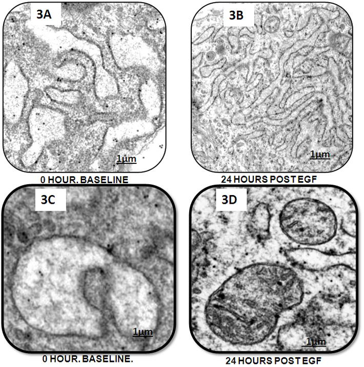 3D. Twenty four hours after the EGF treatment, it is noticeable the substantial transformation of the mitochondria. Mitochondria are far less ballooned with matrix content and exhibiting some cristae.