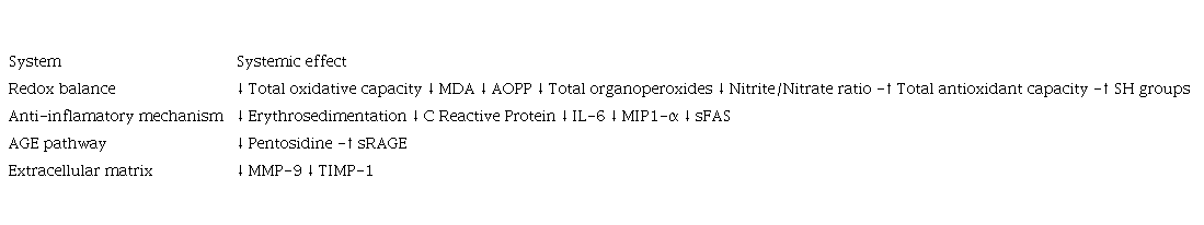 Diabetic patients with lower limb wounds were treated with intralesional infiltrations of EGF (75 μg), three times per week during 3-4 weeks [72, 79]. Systemic antioxidant effects: decrease of circulating levels of total oxidative capacity, malondialdehyde (MDA), advanced oxidation protein products (AOPP), total organoperoxides, and nitrite/nitrate ratio; increase of total antioxidant capacity and sulfhydryl (SH) groups. Anti-inflammatory effects: reduction in erythrosedimentation, C reactive protein, interleukin-6 (IL-6), macrophage inflammatory protein 1-alpha (MIP1-a), and soluble FAS (sFAS). Systemic attenuation of the advanced glycation end (AGE) pathway: decrease in pentosidine, increase in the soluble receptor for AGE (RAGE) circulating levels. Extracellular matrix elements modulated at the systemic level: reduction of matrix metalloprotease 9 (MMP-9) and tissue inhibitor of MMP 1 (TIMP-1).