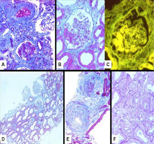 A. Thrombi in glomerular capillaries and small arteries. Area of interstitial fibrosis and tubular atrophy. Masson’s trichrome X200. B. Glomeruli with intracapillary thrombi. Masson’s trichrome X400. C. Thrombi in glomerular capillaries. IF technique X400. D. Area of acute diffuse tubular necrosis. E. Extraglomerular blood vessels with severe thickening of the wall. Masson’s trichrome. X200. F. Twisted arterioles with marked thickening of the wall and partial obliteration of the vascular lumen. PAS X400.