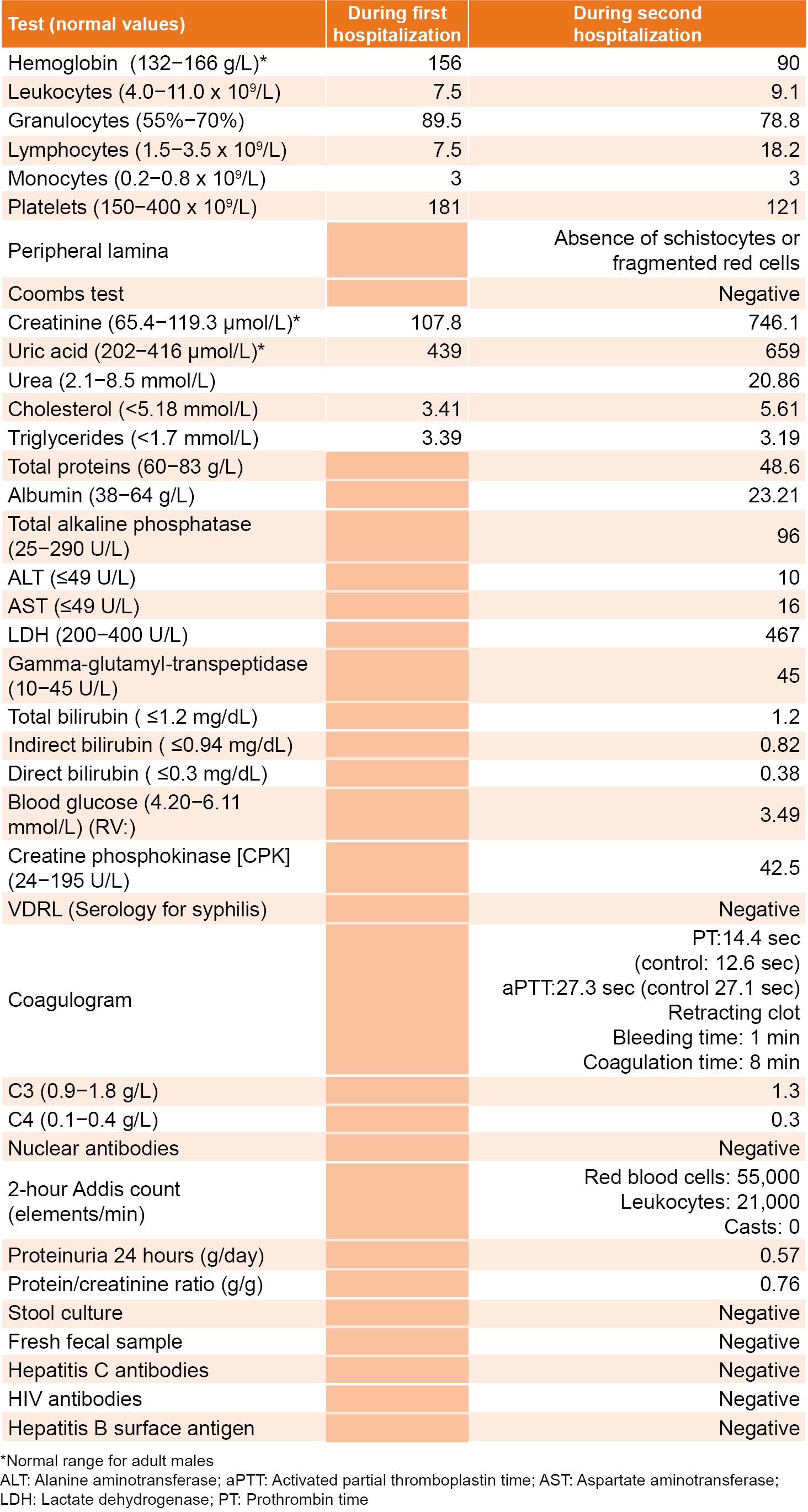 Two weeks after discharge, the patient presented asthenia, anorexia, diarrhea and reduced urine output, along with elevated levels of creatinine (746.1 µmol/L). He was readmitted (with a negative RT-PCR) and required hemodialysis (six sessions). The remaining exams are presented in Table 1. Renal ecography showed a slight rise in ecogenicity in both kidneys, and conserved perfusion. Given the acute renal dysfunction of unknown origin with hematuria, mild anemia (no schistocytes) and thrombocytopenia, a kidney biopsy was performed.
