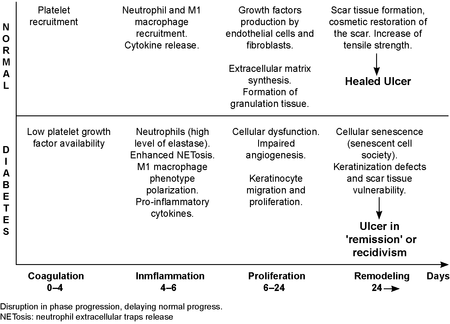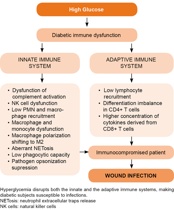 The arrest in this inflammatory phase is not associated with successful control of local infection, and thus it has been proposed that diabetic individuals are more vulnerable to wound infection[98,99] due to the existence of a primary deficit in innate immune response mechanisms.[100,101]