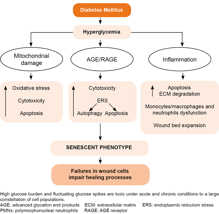 Hyperglycemia, again, seems to act as the proximal trigger for an exaggerated inflammatory reaction (Figure 3). Hyperglycemia and its distal operators—advanced glycation end products (AGE), TNF-α and other pro-inflammatory signalers—exert profound cytotoxic effects in fundamental ‘building-block’ cells of describes tissue.[11,102] Compelling evidence describes an inflammation-prone, pro-oxidative and pro-degradative environment in the core of diabetic wounds.[103–106]
