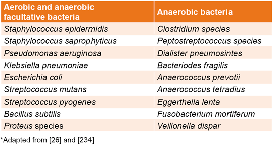 Chronic ulcers usually exhibit polymicrobial infections including a mixture of aerobic/anaerobic and Gram positive/negative bacteria.[227,231] Some of the heterogeneous groups of bacterial species identified in DFU patients have been compiled in Table 1.[26,232–234] Bacterial predominance differs between studies. Nevertheless, recent literature point to Gram-negative bacteria as the predominant group.[23,229,235,236] The reported prevalence included Pseudomonas aeruginosa, Klebsiella pneumoniae, and Escherichia coli.[237,238] Usually, these results are influenced by several factors including infection severity, demographic characteristics, glycemic control, and ongoing or previous antibiotic treatments, as well as bacterial identification method.[26]