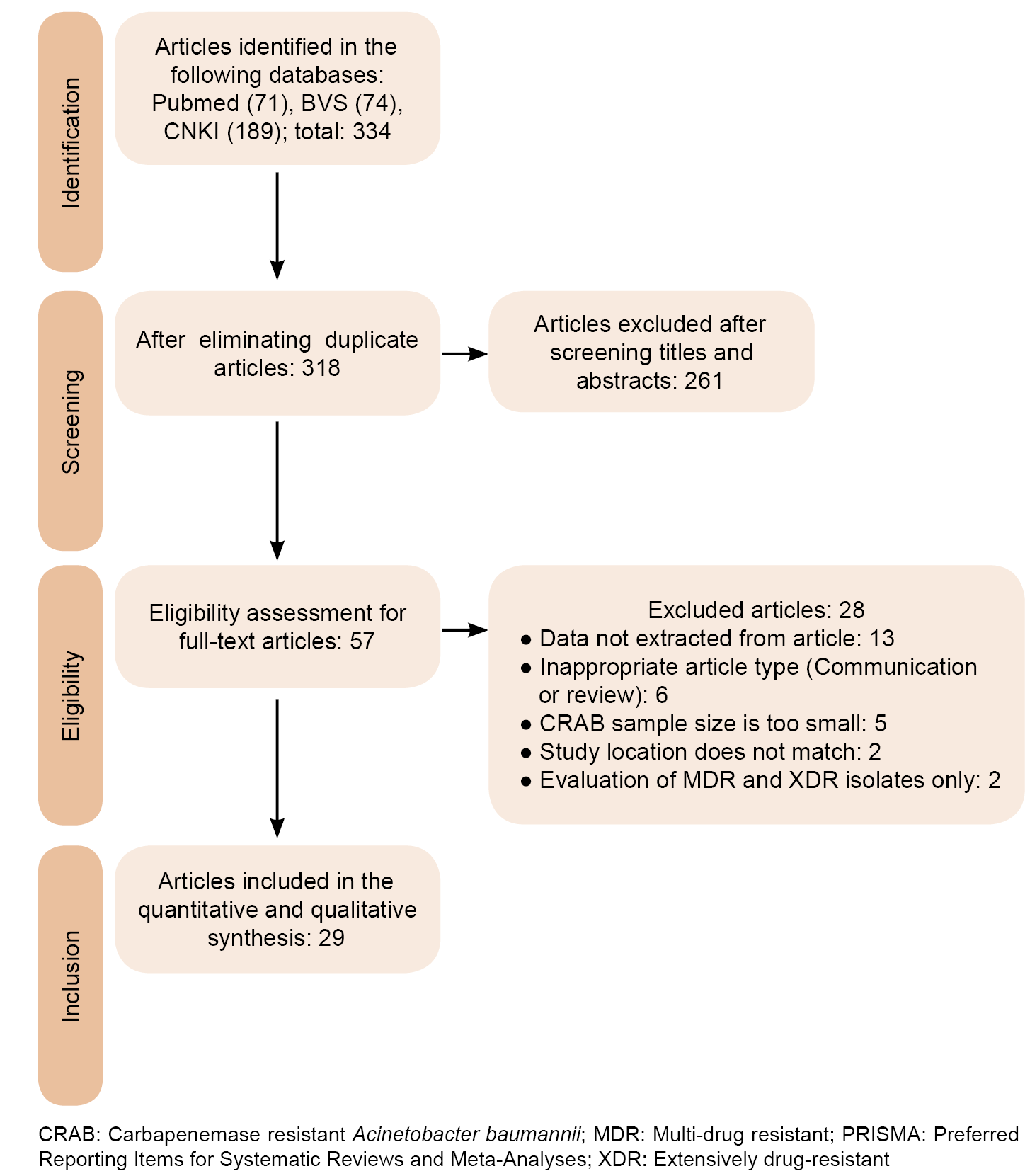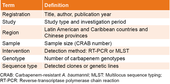 Inclusion criteria We included studies with the following characteristics: 1) observational studies with a cross-sectional design; 2) analysis of A. baumannii clinical isolates in adult populations; 3) reports on CRAB; 4) detection of class A, B and D carbapenemases by molecular methods such as reverse-transcriptase polymerase chain reaction testing (RT-PCR) or MLST; 5) carbapenemase genotype analysis in LAC or China published in 2015–2020 in English, Spanish or Chinese.