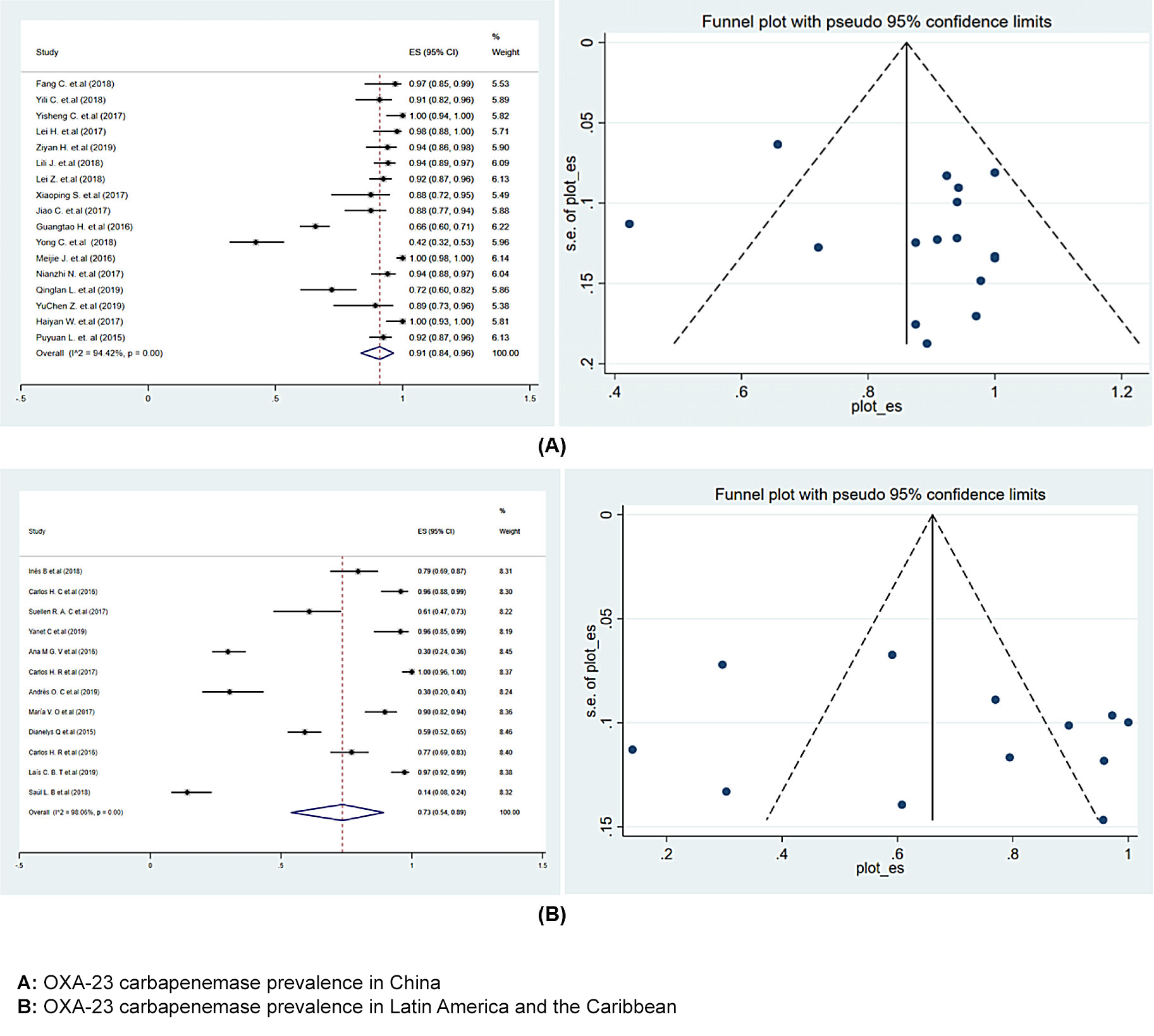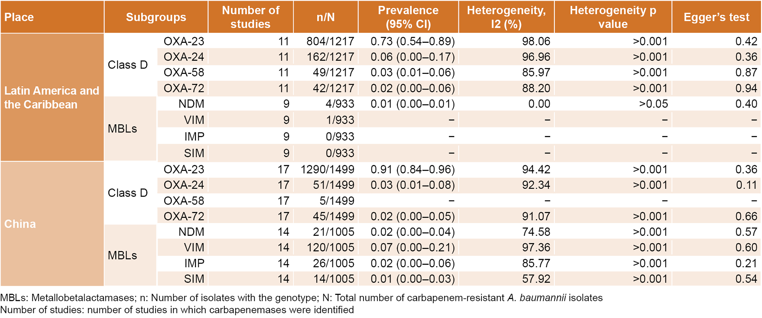Carbapenemase characteristics Of the 29 studies included in this systematic review, 12 were from LAC, involving 11 countries and 17 were from 11 Chinese provinces. OXA-type carbapenemases were detected in all studies. In LAC, OXA-23, OXA-24, OXA-58 and OXA-72 genotypes were predominant, with respective prevalences of 0.73 (0.54–0.89), 0.06 (0.00–0.17), 0.03 (0.01–0.06) and 0.02 (0.00–0.06). In China, OXA-23, OXA-24 and OXA-72 were the most common, with respective prevalences of 0.91 (0.84–0.96), 0.03 (0.01– 0.08), 0.02 (0.00–0.05).