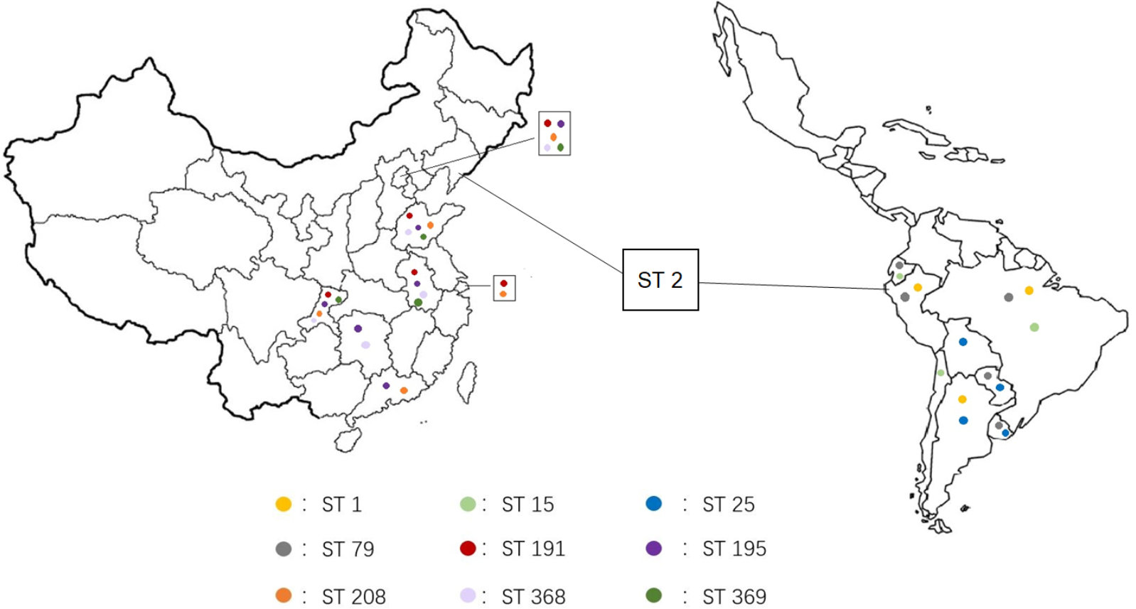 Molecular typing characteristics In 17 of the 29 studies, MLST was performed on CRAB isolates. In total, 41 sequence types (STs) were identified: 16 in LAC and 26 in China. Clear geographical differences were observed in predominant ST frequencies: ST79, ST25, ST1 and ST15 were more common in LAC; while ST195, ST208, ST191, ST368 and ST369 were found more frequently in China. ST2 was found in both (Table 2 and Figure 3).