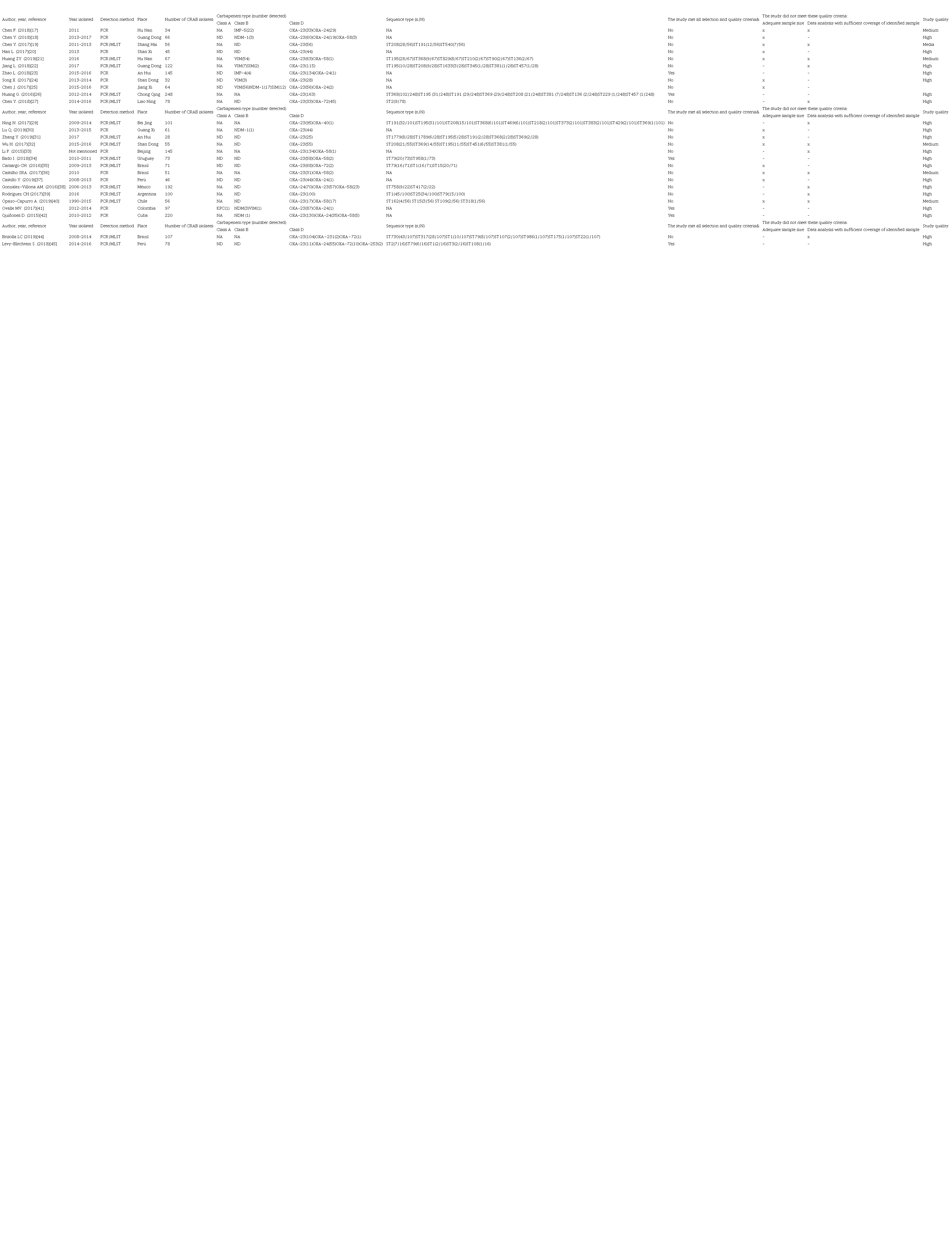 & Quality criteria: 1. The sample was appropriate to address the target population, 2. The sample was obtained using an adequate method, 3. The sample size was adequate 4. Participants and the context are described in detail 5. Data analysis was carried out with sufficient coverage of the identified sample 6. Effective methods were used to identify diseases or health problems 7. The sample was measured using standard and reliable methods for all participants 8. The statistical analysis was appropriate 9. Response rate was adequate or low response rate was adequately managed.n number of times the sequence was foundN total isolates studiedNA Not applicable (detection not performed)ND Not detectedX did not meet the requirement– met the requirement