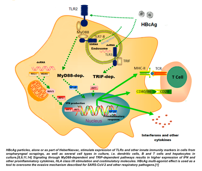 HeberNasvac’s immunostimulatory effect supports its use in post-exposure prophylaxis and therapy for SARS-CoV-2 and, most likely, for other respiratory infections. Commercial agonists stimulating TLR3, as Poly (I:C) and TLR7/8 (CL097M-012), also innervate antiviral, inflammatory and humoral pathways, decreasing viremia and resulting in clinical improvement in dengue-infected monkeys;[31] in cancer, the relevance of TLR3 stimulation is currently under study.[32] Taken together, the stimulatory properties of HeberNasvac, and HBcAg in particular, may open new prophylactic and therapeutic opportunities.