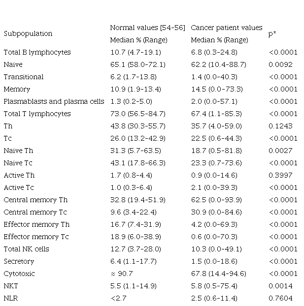 Most naive T and B lymphocyte and NK cell populations were significantly lower in cancer patients than the normal reference median. However, memory lymphocytes and activated Tc were elevated. The neutrophil-to-lymphocyte ratio (NLR) was within normal range (Table 1).