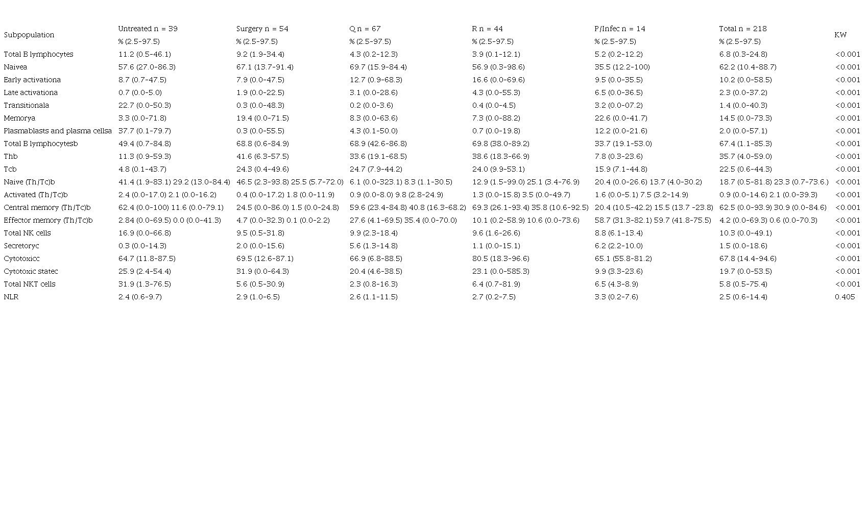 Significant differences were observed in the estimated medians for all lymphocyte populations’ relative concentrations in the five groups (Table 2). We found a wide range inside the 2.5–97.5 percentiles for all lymphocyte subpopulations in the different groups, most notably in patients with untreated controlled disease and B lymphocyte subpopulations.