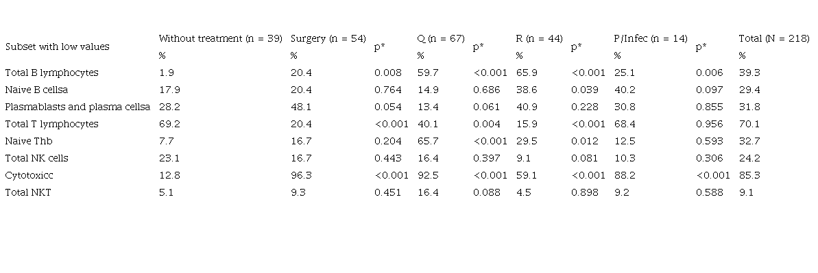 Patients with controlled disease had low total values of T lymphocytes and effector memory T lymphocytes (Th and Tc), but their naive T and B cells were not affected. Cytotoxic-type NK cells were lower than reference values.