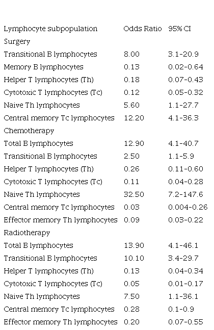 Cancer patients undergoing surgery had an eight-fold higher risk of low transitional B lymphocytes than those who did not receive oncospecific treatments. Cancer patients who underwent surgery had a lower risk for low concentrations of memory B lymphocytes, Th and Tc, with risk reductions of 7.8, 5.5 and 8.3 times, respectively (Table 4).