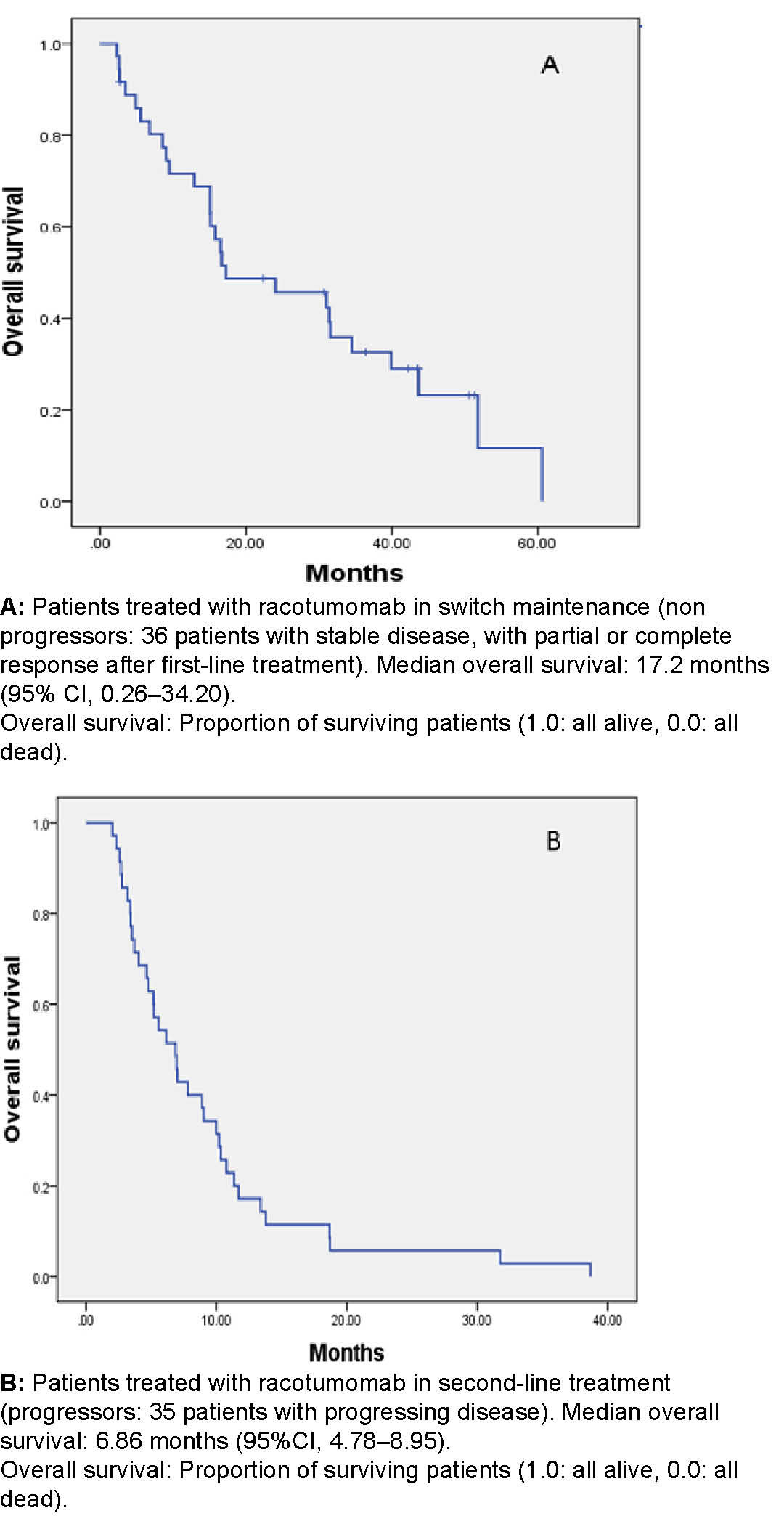 METHODS A descriptive, retrospective study was carried out in patients diagnosed with non-small cell lung cancer not suitable for surgical treatment, who received racotumomab as a part of switch maintenance or second-line treatments. Overall survival was defined from diagnosis and from the first immunization, until death.