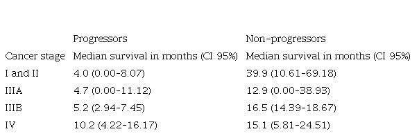 Our survival results in stages I and II differ from those published by Arnold.[41] In our study, no patient received surgical treatment (even in early stages) because surgery was contraindicated. Our results are better in stages IIIB and IV. The lower survival in stage IIIA, as compared to IIIB, could be due to the fact that most of these patients were already progressors at the start of immunization with the vaccine.
