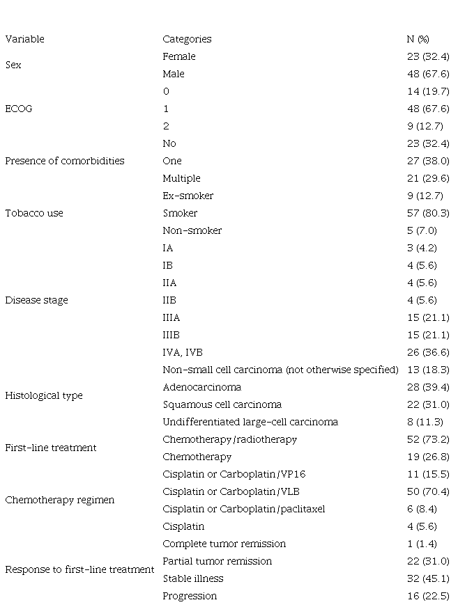 Median age of patients was 66 years. Of the total, 67.6% (48/71) presented at least one comorbidity and the vast majority were smokers. More than half of patients (57.7%, 41/71) were in locally advanced or metastatic stages. The main histologic subtype was adenocarcinoma, followed by squamous cell carcinoma. It was not possible to determine the histologic subtype in 13 patients (18.3%) (Table 1).