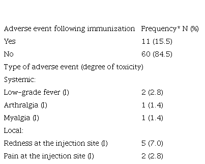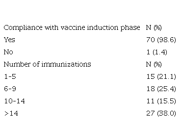 Of the total, 98.6% (70/71) of patients adhered to the vaccine induction phase (first 5 doses administered at 14-day intervals); 38.0% (27/71) received over 14 vaccine administrations during more than one year of treatment. The most frequent cause of treatment discontinuation was disease progression (57 patients) and 2 dropped out of vaccination (Table 2). 84.5% (60/71) had no adverse events following immunization, and 15.5% (11/71) reported some mild events (Table 3).