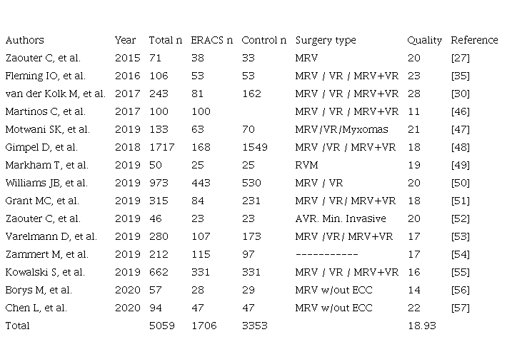 The 15 selected articles contributed 5059 patients (ERACS group: n = 1706; CG: n = 3353). The methodological quality of the studies was good. Ten of the 15 articles (66.7%) scored ≥18 points out of a maximum of 36 possible in the MINCIR guide (Table 1).