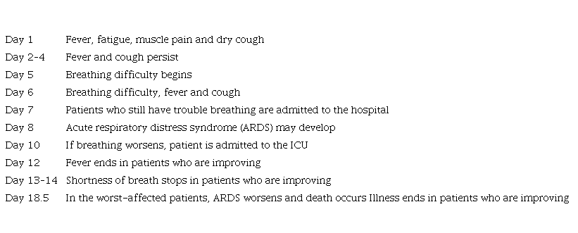 Note that the first respiratory symptoms begin on the first day of the clinical evolution. Acute respiratory distress syndrome occurs approximately at day 8.