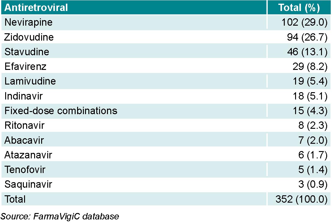 Of the antiretrovirals, nevirapine had the highest number of reports, followed by zidovudine (Table 1).