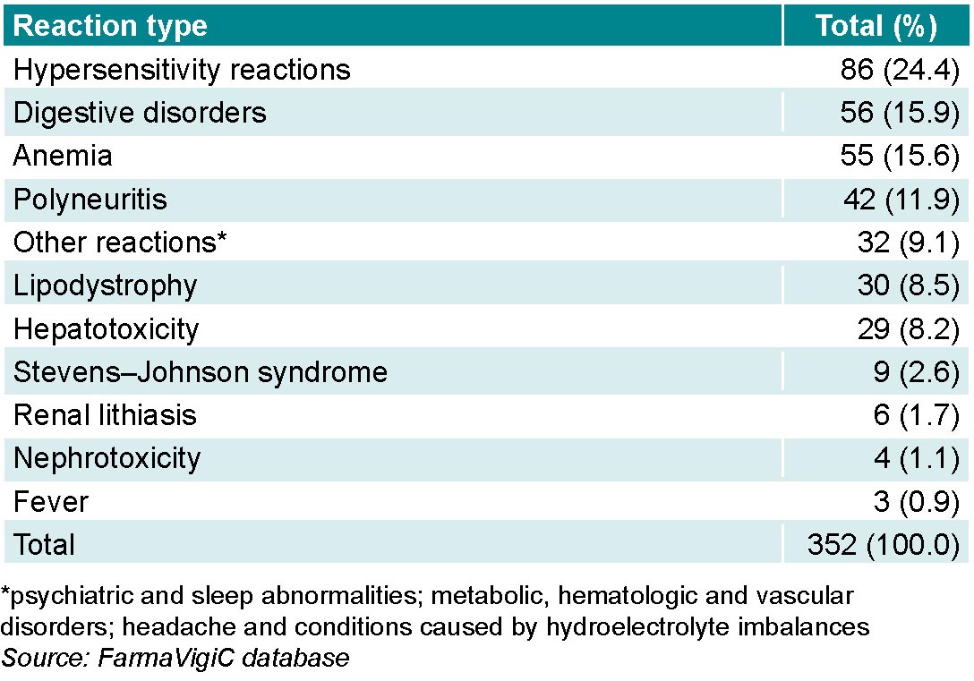 Hypersensitivity reactions accounted for the greatest number of ADRs, followed by digestive disorders and anemia, in which the number of reports differed by a single report. Although hepatotoxicity is not one of the most common ADRs (8.2%; 29/352),it needs to be considered because of its severity (Table 2).