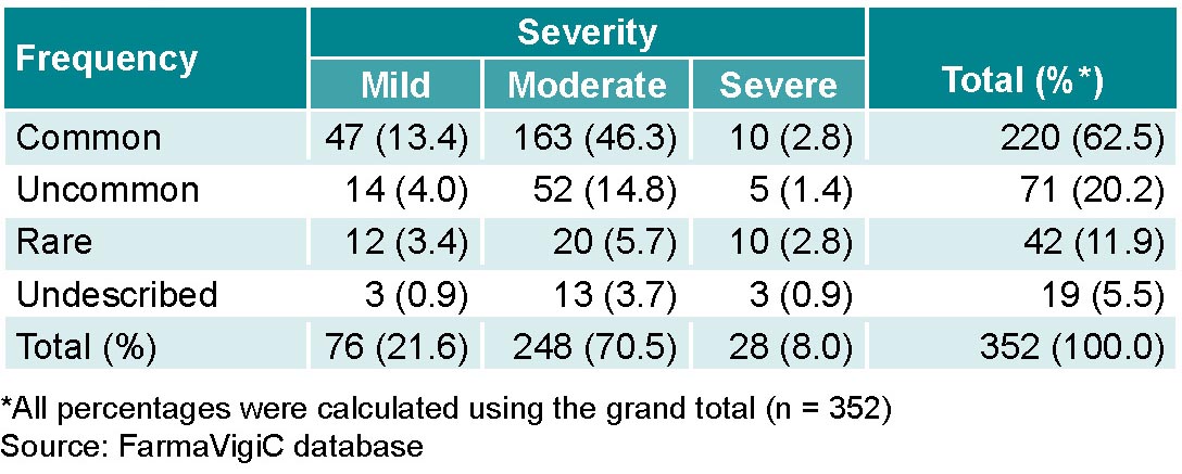Frequency: common, uncommon, rare, undescribed. Classified according to the criteria of the Cuban Pharmacovigilance System,[22] which uses the categories and events within each category established for each drug in the National Drug Formulary. The total number of occasional, rare and undescribed adverse reactions were coded together as low-frequency adverse reactions.