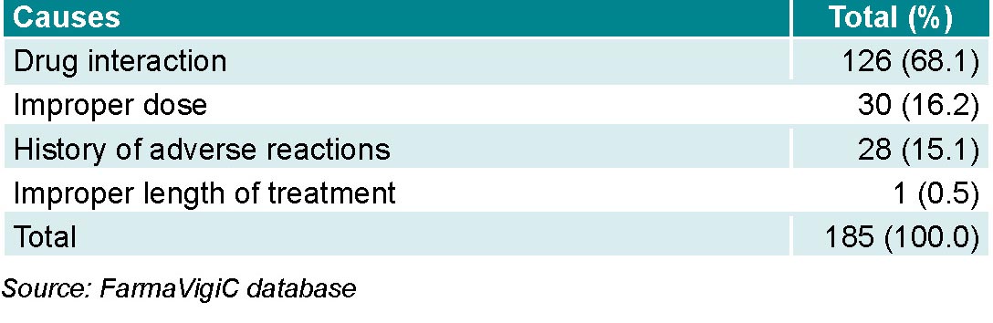 Preventable ADRs made up 52.5% (185/352) of all notifications. Main causes were drug interactions (with drugs in the same drug class or any other that the patient was taking), inappropriate dosage, and a history of ADRs to the suspected drug. Drug interactions alone made up nearly 70% of preventable reactions (Table 4).