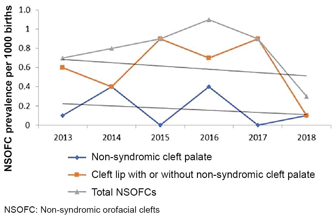 A recent meta-analysis estimated NSOFC prevalence at 1.38 per 1000 births in low- and middle-income countries.[35] Risk factors are often interrelated; for example, Chileans with higher NSOFC rates are in the lowest socioeconomic strata and are also more likely to be of indigenous ancestry.[5] Possible explanations for differences in prevalence among geographic regions and socioeconomic statuses include environmental factors like vitamin intake, nutrition, access to health care and education and lifestyle-related factors, like smoking and alcohol abuse.[36,43] The decrease in cases after 2016 in our study could be attributed, in part, to increasing consumption of folic acid. In mid-2015, Villa Clara province implemented a program promoting preconceptive use of folic acid supplements in all women of childbearing age.