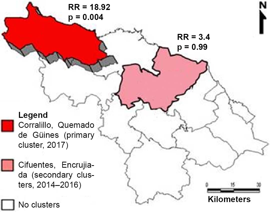 Both primary and secondary spatiotemporal NSOFC clusters were observed in Villa Clara from 2014 through 2016 (Figure 3), and we collected information on these clusters (municipalities, observed and expected case numbers, statistical analysis results related to relative risk, p-values) (Table 2).