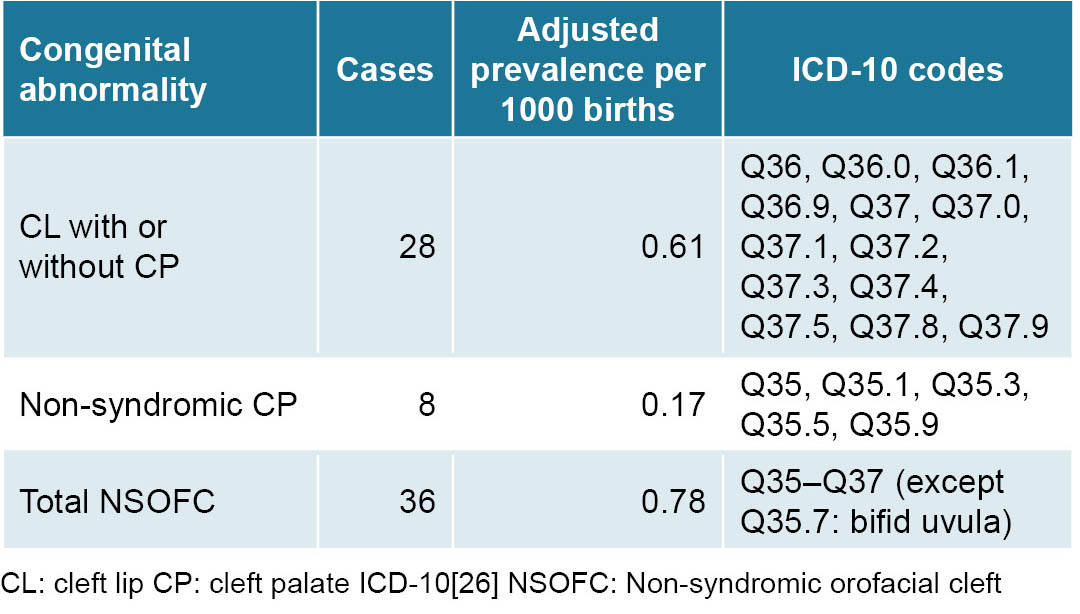 Congenital abnormalities were coded according to the ICD-10.[26] All cases with syndromic NSOFC were excluded from the study. In all cases, diagnosis was confirmed by clinical genetics specialists at the Villa Clara Provincial Medical Genetics Center.