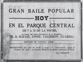 Como parte de los esfuerzos de las autoridades de Gobierno por integrar a la población a la celebración de la llegada del nuevo Presidente de la República, está la organización de un “Gran baile popular” que se realiza en el Parque Central de San José, cuyo atractivo buscaba aumentarse con el hecho de que contaba con “cantina abierta” (ver Figura 3). El hecho de organizar un baile abierto a todo público, y en el que se estaría regalando licor, al principio parece contrario a la precaria situación económica por la que atravesaba el país y el espíritu de austeridad con el que Calderón Guardia había anunciado que se iban a realizar las actividades relacionadas con su toma de poder; sin embargo, esto tiene sentido si se piensa que es una forma de hacer a la población olvidar, al menos momentáneamente, el difícil momento que atravesaban sumándose a la celebración por el inicio de un nuevo periodo de Gobierno. Asimismo, esta actividad ayudaba a afianzar en el imaginario de la población este momento de felicidad y celebración con la llegada de Calderón Guardia a la Presidencia, ayudando a construir legitimidad y aceptación popular para su Gobierno; al mismo tiempo, podría funcionar como un mecanismo o estrategia para disminuir la tensión política y social que atravesaba el país en ese momento.