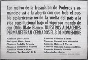 Las actividades realizadas por personas y empresas privadas para celebrar la toma de poder de Ulate Blanco también hicieron su aparición; una de ellas fue la publicación en la prensa por parte de empresas, asociaciones, personas e identidades públicas de mensajes de felicitación a Ulate Blanco por su toma de posesión, así como la manifestación de deseos acerca de que su ascenso al poder trajera estabilidad y paz social a Costa Rica; incluso, los comercios anuncian que cerrarían sus puertas el 8 de noviembre para unirse a las celebraciones de ese momento histórico (ver Figura 5). Entre las organizaciones que publicaron mensajes de apoyo por la toma de poder de Ulate Blanco se encontraban: el Banco de Costa Rica, la Cervecería Traube, la Cámara de Comercio de Costa Rica, Almacén Rodríguez Hnos., la Compañía Nacional de Fuerza y Luz, la compañía Bananera de Costa Rica, la compañía Taca de Costa Rica, Mendiola y Compañía, el Centro Israel Sionista, entre otros.