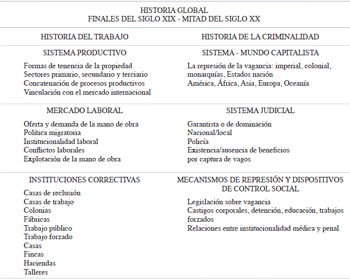 La tabla 1 reúne una propuesta para articular el estudio de la vagancia combinando las perspectivas de la historia del trabajo y la historia de la criminalidad. Esta propuesta surge como réplica a la tendencia en algunas investigaciones de privilegiar una u otra dimensión, cuando lo preferible es complementar ambas aristas, pues no se entienden bien los motivos para la penalización global de la vagancia, si no se atiende a las tensiones entre los conflictos laborales, las características del mercado laboral y los aparatos de poder político. En este ámbito, a través del análisis del discurso político (presente en mensajes presidenciales, documentos legislativos, artículos de opinión y otros) puede estudiarse el interés por morigerar las costumbres populares en torno al trabajo y controlar a poblaciones que se consideran perjudiciales u opuestas al orden. Se considera posible vehiculizar el estudio de las políticas para la producción de subjetividades y las políticas sociales, así como aquellas dirigidas a la contención de los conflictos sociales, en los ámbitos que unen las políticas criminales y la cuestión económica. Sin embargo, sería importante apuntar que los expedientes por vagancia evidencian un heterogéneo contingente de personas con distintas cualidades y proveniencias. Este aspecto será analizado en otro artículo fundamentado en la propuesta presentada en la tabla 1.