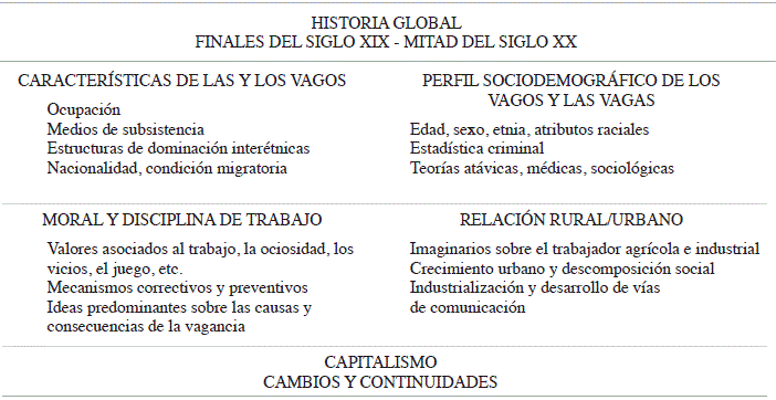 La periodización del estudio se hizo a partir del análisis cruzado de fuentes y antecedentes nacionales e internacionales, con el fin de identificar variaciones en las dinámicas de la persecución de la vagancia en el largo plazo, frente a coyunturas políticas determinadas y continuidades o transformaciones tanto de índole económica como social. Se historizó las leyes e instituciones encargadas de normativizar y reprimir la vagancia -entendida como el incumplimiento de la normativa laboral en Costa Rica-, y las relaciones entre ocio, trabajo y descanso, así como los discursos y la moral acerca del trabajo, la laboriosidad, el ocio, los vicios y la vagancia. A continuación, se procede a inscribir la represión de la vagancia en su dimensión global.