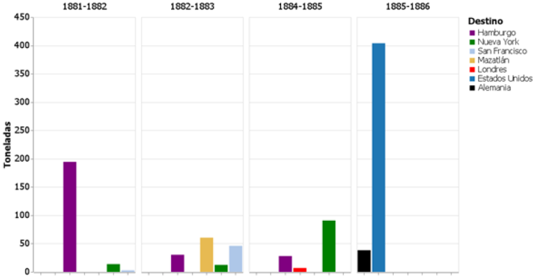 En general, las figuras 5, 6, 7 y 8 muestran que hay una gran variabilidad en la producción de café por distrito, tanto entre distritos, como para uno mismo a lo largo del tiempo. Además, se puede observar que la producción de café aumentó a partir de 1879 en el caso de los distritos de menor y mayor producción (figuras 3, 5 y 6). En el caso de los distritos de producción media (figura 6) no se puede ver un incremento en la producción hacia el final del periodo considerado.